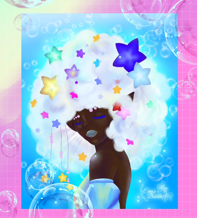 On dit qu’elle a souvent la tête dans les nuages quand en réalité elle a un nuage sur la tête. Découvrez Afro fantaisie une illustration fantastique basée sur l’expression « avoir la tête dans les nuages » une illustration haute en couleur et imaginative.